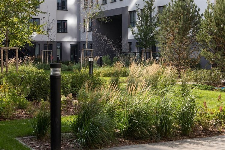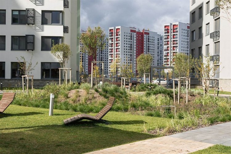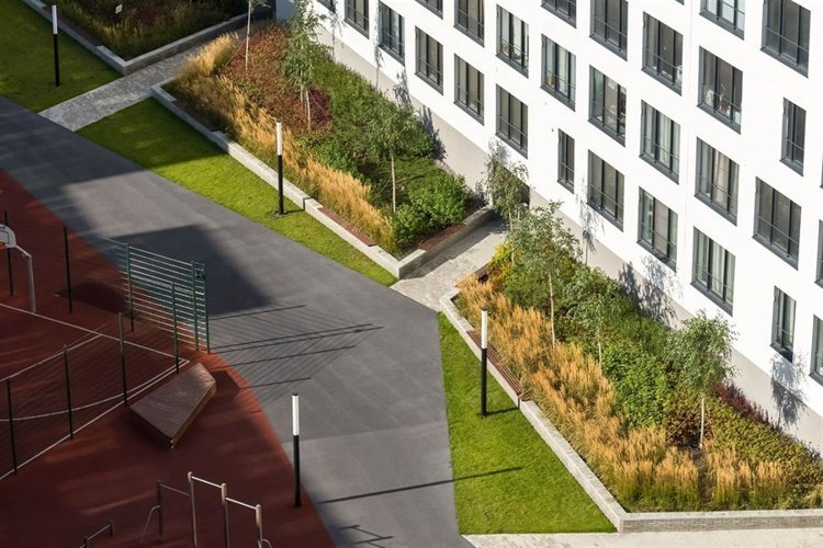 Все дома в квартале имеют общий принцип организации дворов: они приподняты над землей и отгорожены от шума улицы массивом зданий. Это приватные пространства с местами для отдыха и прогулок, зелёными холмами, травами и кустарниками.