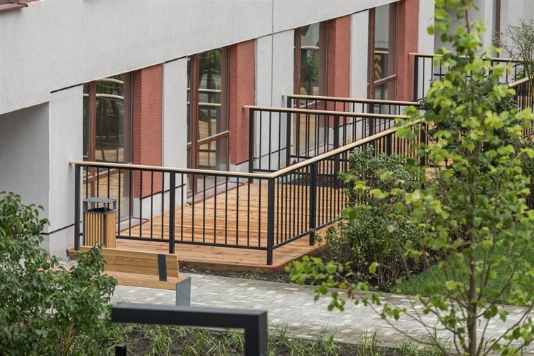 Элементы интерьера подъездов повторяют ритм и декор фасадов квартала. В основе концепции — уют и функциональность. Приглушенное освещение создает расслабленную и домашнюю атмосферу. На первом этаже предусмотрено место, где можно оставить коляску или велосипед. Все двери — светопрозрачные: видно, что происходит в подъезде и вне его. Пространство остаётся проницаемым и безопасным. Вход в подъезд осуществляется с уровня улицы, без ступеней и иных барьеров.