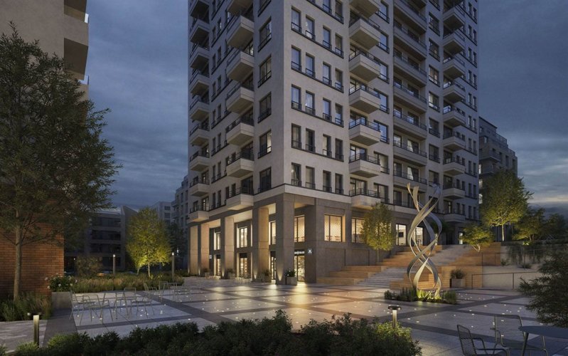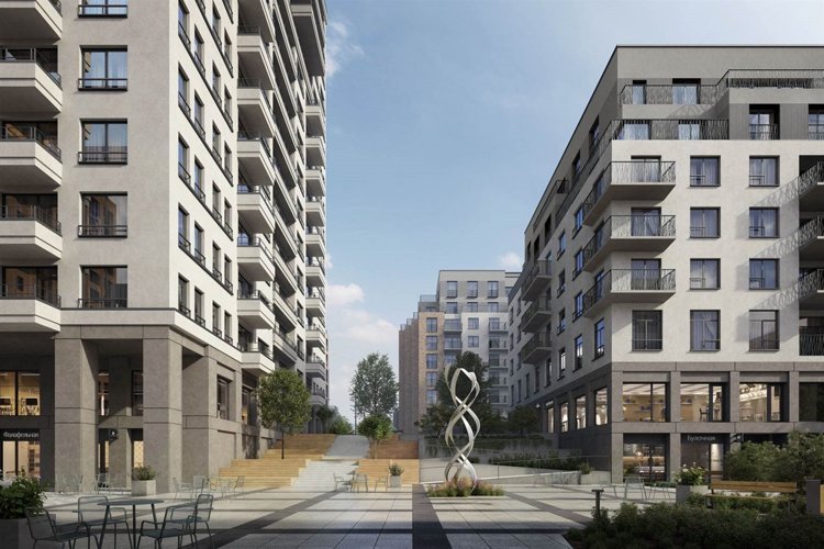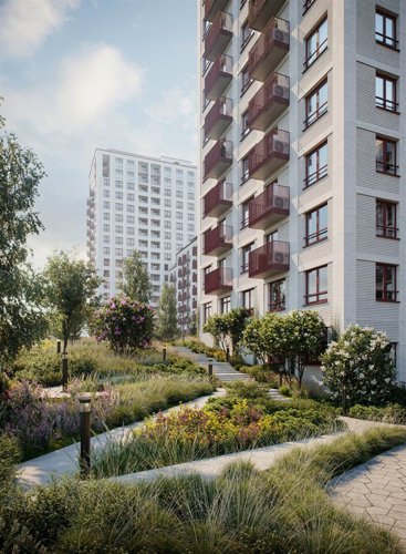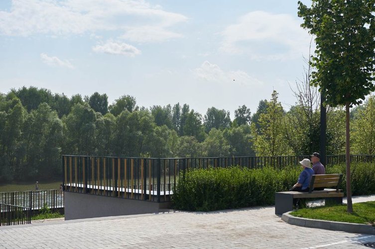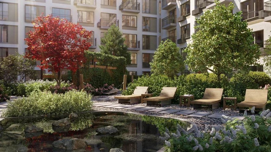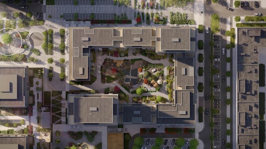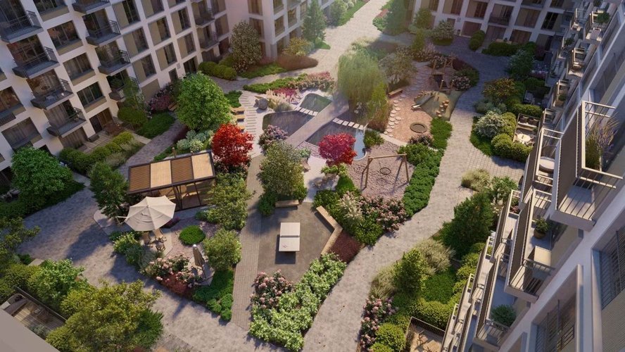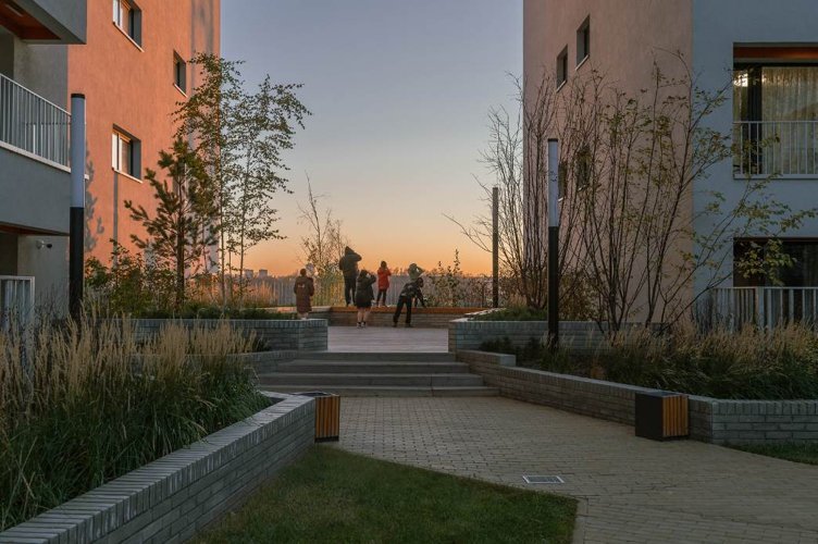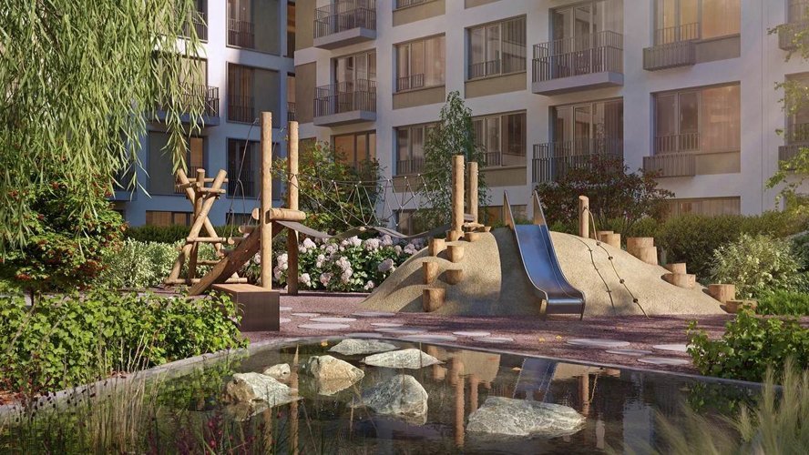 Спортивные площадки (уличные тренажеры, велосипедные дорожки, площадки для мини-футбола и баскетбола). Детские развивающие площадки с прорезиненным покрытием. Дворы микрорайона закрыты от машин и представляют собой зелёный сад для отдыха жителей. Центральной осью через весь микрорайон пройдёт торговая улица. Проектом предусмотрена набережная с общественными площадками для игр и спорта, пешеходными аллеями.